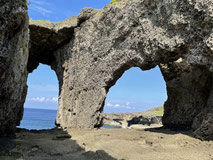 隆起したサンゴ礁が季節風や荒波によって浸食されてできた奇岩や断崖のことを、当地では「犬の門蓋(いんのじょうふた)」と呼んでいます。