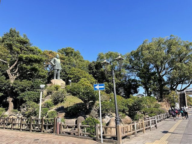 城山を背景に陸軍大将の制服姿で立つ、高さ8メートルの銅像です。